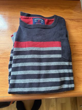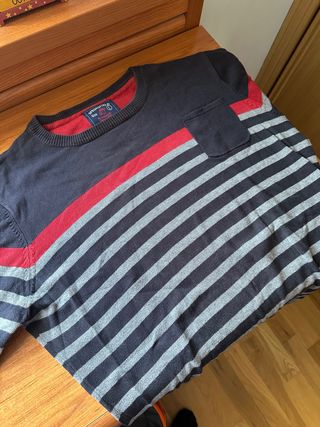 Jersey de punto con diseño de rayas horizontales y un bolsillo en el pecho. - Diseño de rayas en azul marino y gris. - Detalle de banda roja diagonal. - Cuello redondo.