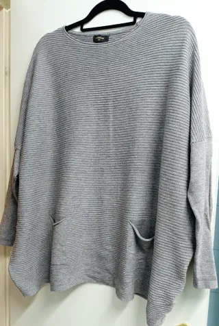 Jersey de punto grueso con un diseño de canalé vertical que le da textura. Su corte oversize lo hace muy cómodo y versátil. Talla grande, perfectamente puede servir para una M o L dependiendo si te gusta llevarlo holgado o ceñido. Sin duda, este jersey no es ceñido. Nunca lo he usado. - Cuello alto. - Manga larga. - Bajo y puños de canalé.