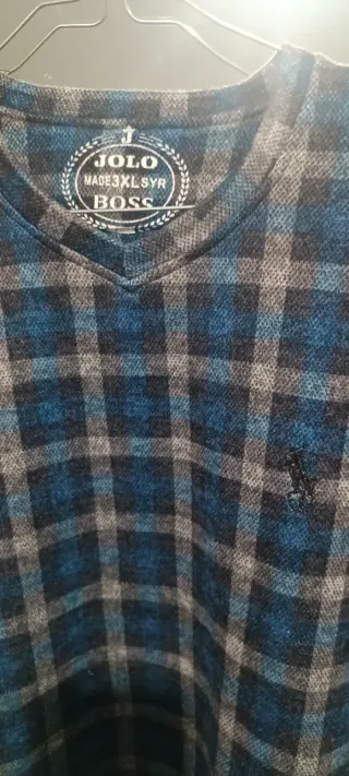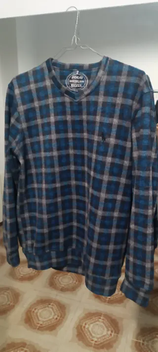 Jersey de manga larga con un diseño a cuadros en tonos azules y grises. Presenta un pequeño bordado en el pecho. -Es talla L pero talla muy ajustado, queda como una M. - Cuello en V. - Tejido suave y cómodo.