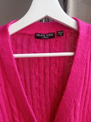 Jersey de punto con trenzas de la marca Bravo Soul london en talla XS (estilo oversize). - Diseño de cuello en V. - Cierre de botones. - Dos bolsillos delanteros.