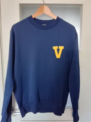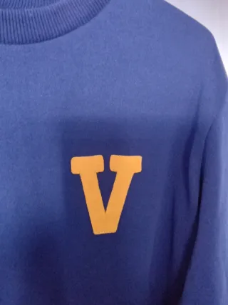 Jersey azul de estilo vintage con el escudo del colegio Viaró, Santa Cugat, la letra V en color amarillo. Tiene 40 años y está en muy buen estado. 50% algodón y 50% poliéster. Marca "trainer". Pone talla 5 en la etiqueta y equivale a una M. Hombros: 48 cm, largo 70 cm - Talla M. - Diseño clásico. - Cuello redondo.