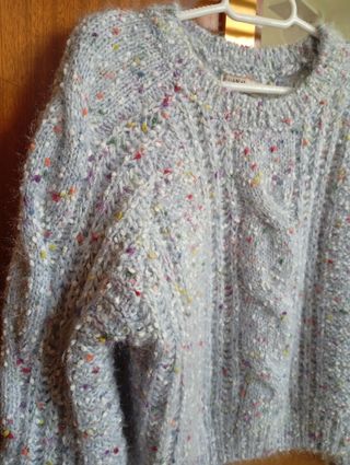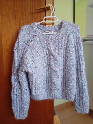 Jersey grueso azul celeste con motas de colores de Pull&Bear, que talla justo a la altura del ombligo (tipo crop). Como orientación, yo mido 1.68. Es una talla M, queda anchito, no ajustado.