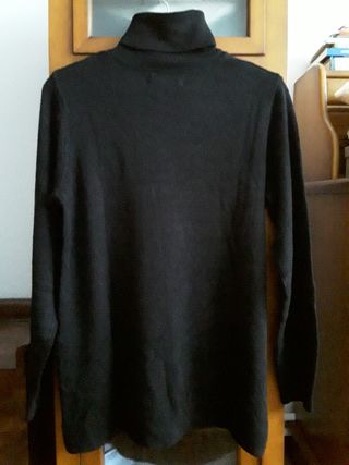 Vendo este jersey en tono negro. Tiene 40% de viscosa y 60% de lana. Es muy abrigoso y de cuello alto. Tiene de largo 51cm. y de ancho 45 cm. Debe ser la talla M. Precio 15€