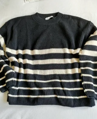 Jersey de Zara de rayas horizontales en beige y marino. Es una talla S amplia, oversize, realmente una M. Usado en buen estado, sin bollitos