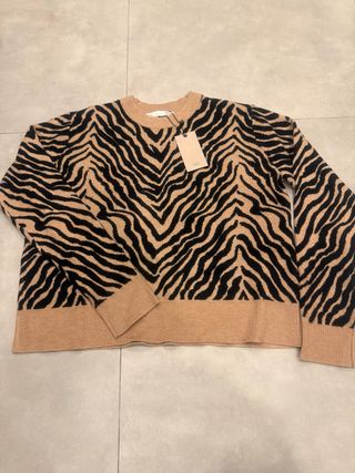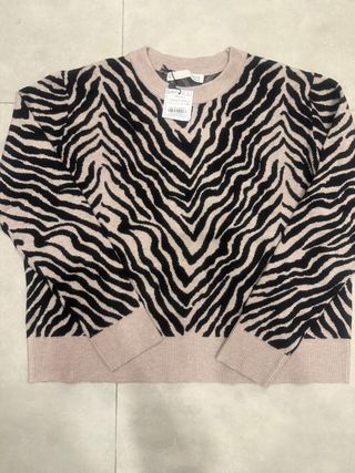 Jersey de punto con estampado de rayas de cebra. - Diseño llamativo en tonos beige y negro. - Cuello redondo y manga larga. - Tejido suave y cómodo.