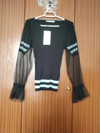 Jersey de punto fino en color negro con detalles llamativos. - Mangas largas de tul negro con volantes en los puños. - Rayas horizontales en color azul claro en la parte superior de las mangas. - Rayas horizontales en color azul claro en la parte inferior del jersey.