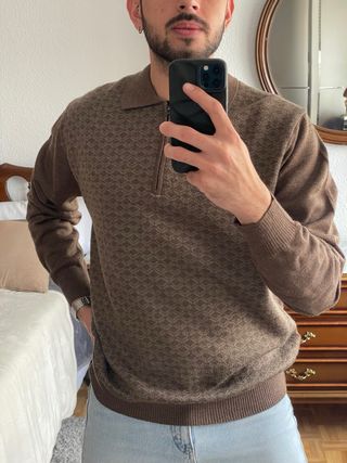 Jersey de punto con un diseño geométrico sutil en tonos marrones. Figura como talle L, pero el calce no es tan amplio, puede ir también para un M según cómo te guste usarlo. - Cuello tipo polo con cremallera. - Manga larga. - Puños y bajo de canalé.