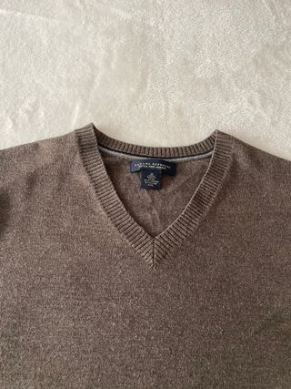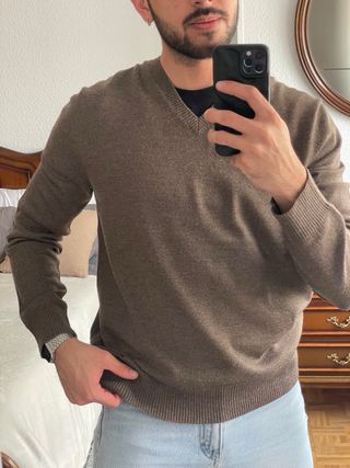 Jersey de punto fino de Massimo Dutti en color marrón. Es un básico versátil para cualquier armario. Jersey gris Massimo Dutti talle L (equivale a M) - Cuello en pico. - Manga larga. - Puños y bajo acanalados.