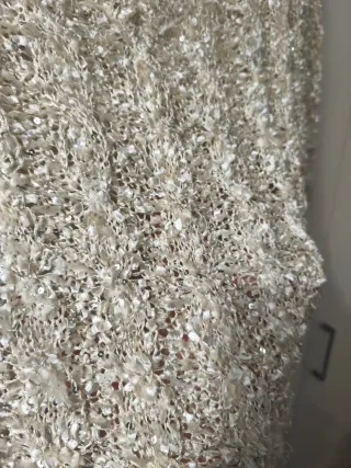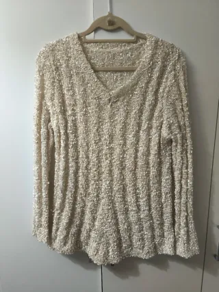 Jersey tejido con lentejuelas de cuello en pico de color crema o beige. En buen estado. No tiene etiquetas pero creo que es una talla M (más holgado estilo oversized) o L (más ajustado), dejo medidas. Medida hombros: 60 cm Medida sisa a sisa: 68 cm Medida largo: 74 cm