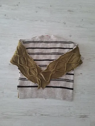 Jersey de Stradivarius con un diseño de crochet y rayas multicolor. Su corte oversize lo hace muy cómodo. - talla M - muy bien estado y muy poco uso - Diseño de crochet. - Patrón de rayas. - Manga larga pero fresco