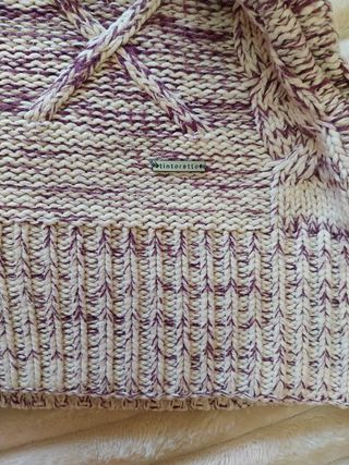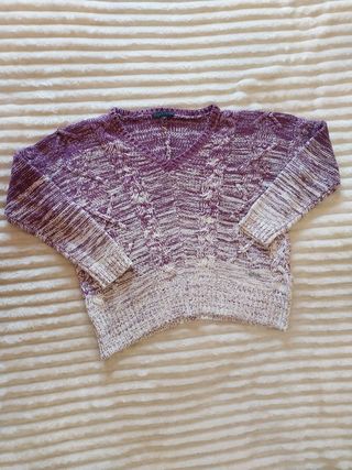 Color: Mezcla degradada de tonos morado y crema, que crea un efecto visual moderno y cálido. Marca: "Tintoretto". Talla "38". Jersey de suave hilo grueso, muy agradable al tacto. Tejido con trenzas decorativas al frente y en mangas. Escote en V. Acabado acanalado en el bajo y los puños. - Diseño jaspeado. - Cuello en pico. - Tejido con trenzas.