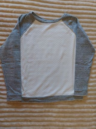 Color: Gris y blanco. Marca: "Salsa". Talla "M". Jersey casual que combina un cuerpo blanco con textura geométrica en relieve y mangas raglán en tono gris jaspeado. Cuello redondo. Bicolor con costuras decorativas vistas. Placa metálica con el logo Salsa en el bajo delantero.