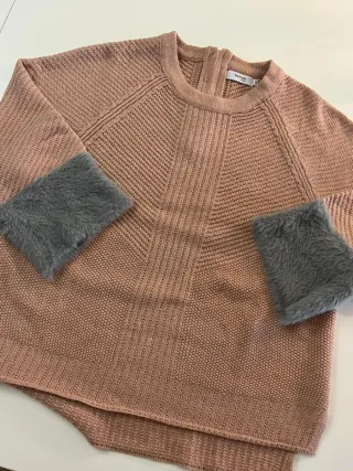 Jersey de punto en color rosa con detalles de pelo gris en los puños. Diseño moderno y cómodo. - Manga larga. - Cuello redondo. - Cierre de cremallera en la espalda.