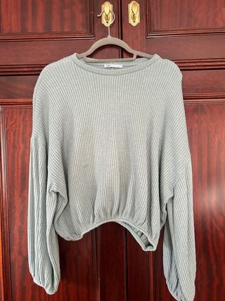 Jersey de Zara con tejido acanalado. - Manga larga abullonada. - Bajo elástico. - Cuello redondo.