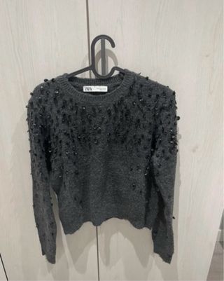 Precioso jersey de Zara en color gris, talla S. Es de punto suave y tiene detalles de lentejuelas negras. - Acabado impecable. - Perfecto para cualquier ocasión. Está nuevo.