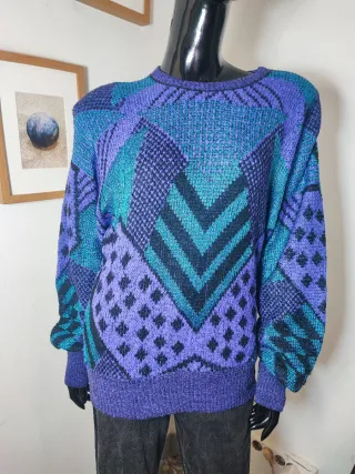 Auténtico jersey de punto vintage con un llamativo y colorido estampado geométrico en tonos morado, azul y verde azulado. Este suéter de estilo "funky". Composición del material: Viscosa Lana Acrílico Nylon Medidas aproximadas (talla única M oversized) Hombro a hombro: 54 cm Axila a axila (pecho): 59 cm Largo total (espalda): 65 cm Largo de manga: 62 cm
