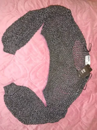 Jersey de punto fino con hilo plateado, ideal para añadir un toque brillante a tu look. - Diseño de manga larga. - Tejido calado. - Cuello redondo -Es un jersey top corto. Nuevo con etiqueta.