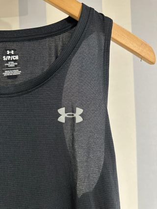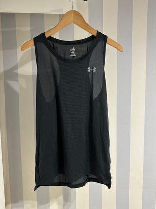 Camiseta técnica Under Armour Negra (Talla S) Vendo camiseta técnica jersey sin mangas para hombre. Marca Under Armour Original. Color Naranja. Talla S (Pequeña). Ideal para Running, Gym, CrossFit, fútbol, etc. Logo de la marca en el pecho. Es nueva con etiqueta. Oportunidad. Rebajas. Liquidación. Ganga. Precio 8€. Hago envíos rápidos.