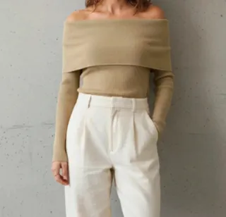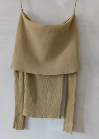 Jersey de punto fino en color beige, con detalles de botones en los hombros. Le falta un botón. - Cuello redondo. - Manga larga. - Diseño elegante y versátil.