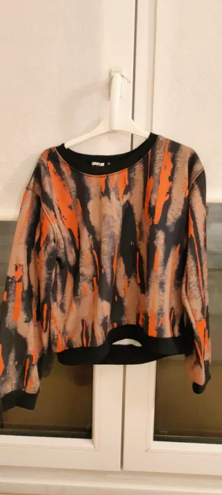 Jersey de la marca Sophiyline con un diseño llamativo y moderno. - Talla S. - Puesto solo dos veces, en excelente estado. - Estampado multicolor con tonos naranja y negro.