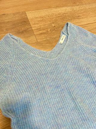 Jersey de punto fino en color azul cielo. Tiene un cuello en pico y mangas largas. - Tejido suave y ligero. - Diseño de canalé. - Calientito.