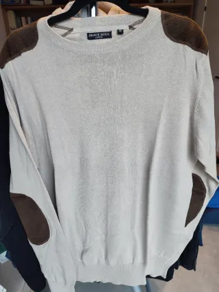 Jersey de punto de la marca Brave Soul en color beige, con detalles de coderas en marrón. Se encuentra en muy buen estado, apenas usado. - Cierre de cuello redondo. - Tejido de punto. - Coderas de ante.