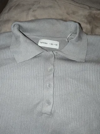 Jersey de punto fino con cuello polo y manga larga. Tejido elástico. Talla XL. Medidas: Pecho sin estirar: 35 cm Pecho estirado: 70 cm Cintura estirada: 80 cm Largo sin estirar: 45 cm Largo estirado: 55 cm - Diseño de canalé. - Cierre de botones en la parte delantera.