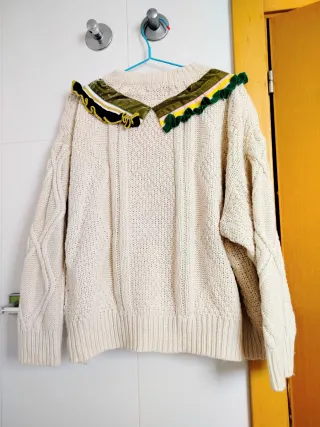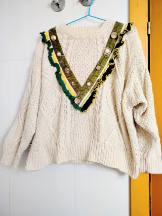 Jersey de punto grueso en color beige, con un diseño de trenzas y detalles decorativos en el cuello. - Adornos en forma de V en el escote. - Ribetes de terciopelo verde y cintas de colores. - Botones dorados y apliques decorativos. Precio 5.50 euros no negociables ✔ No se aceptan ofertas. ✔ Solo venta a traves de envíos ✔ Contesto rápido y envío en menos de 24 horas