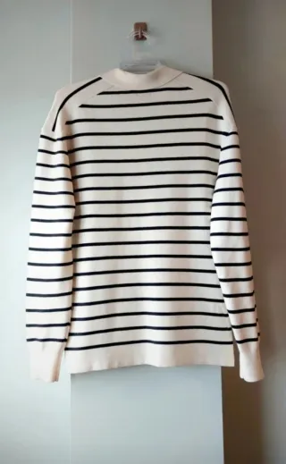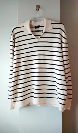 Jersey de Massimo Dutti con diseño de rayas horizontales. Confeccionado en viscosa 69% ofrece un tacto suave y agradable. - Cuello tipo polo. - Manga larga. - Color negro crema - Ancho de axila a axila 57cm. - Largo 67cm. - En Perfecto estado 🤩