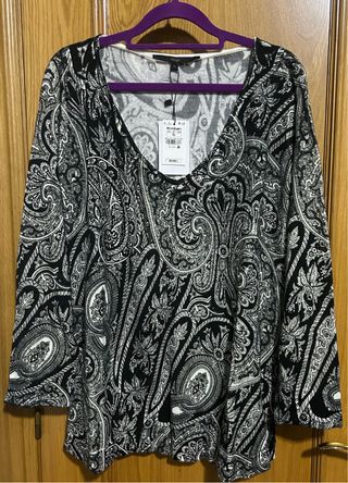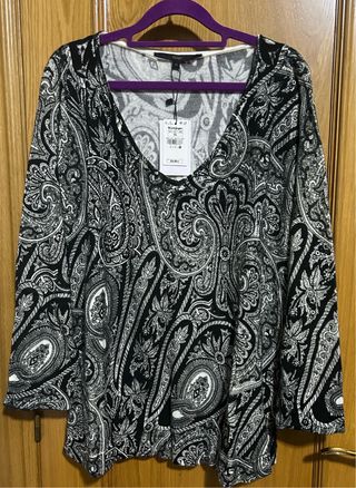 Jersey de punto con estampado de hojas en azul marino sobre fondo blanco. Presenta un bajo asimétrico con un tejido vaporoso., tallaje mas pequeño es decir talla como L-XL. En perfecto estado - Manga tres cuartos. - Cuello redondo.