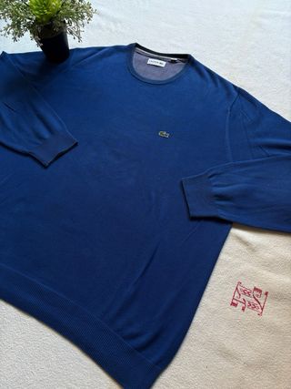 Jersey de punto azul de la marca Lacoste. Presenta el icónico cocodrilo bordado en el pecho. - Cuello redondo. - Manga larga. - Puños y bajo acanalados. - Talla 7 (equivalente a una XL) Se aceptan envíos y venta en mano (Barcelona ciudad)