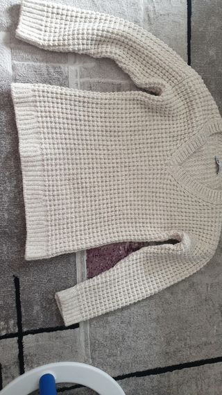 Suéter de punto de Zara en color beige. Aunque la etiqueta pone talla S, da para una XL. - Acabado en punto waffle. - Manga larga. - Cuello en pico.