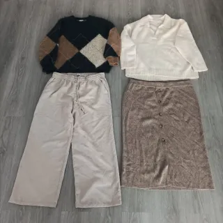 El de la izquierda está formado por: - Pantalón de micropana ancho color beige, super cómodo de la marca JDY talla XXL, es de esta temporada, sin uso. - Jersey Only Carmakoma talla M (46-48), de esta temporada, a la venta en el corte inglés, está impecable El de la derecha está formado: - Jersey básico, color beige de HyM talla XL pero talla grande como una XXL, como nuevo - Falda de punto de Only Carmakoma, nueva sin estrenar, talla L (50-52), al ser de punto y ir más pegadita queda también perfecta en una talla 48