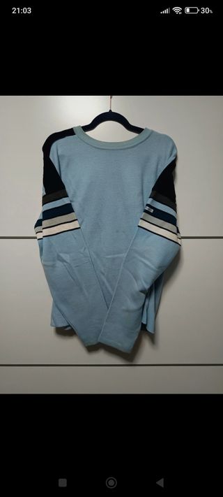Jersey manga larga en tonos azules, tiene cuello y tres botones en el escote. Tiene detalles en parte delantera y mangas. Talla 48 Medidas ancho 55 largo 56 Sin etiqueta En muy buen estado