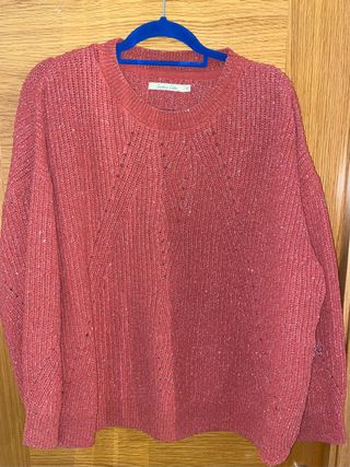 Jersey de punto fino con hilos brillantes en tono coral. Diseño con cuello redondo y manga larga. - Tejido ligero con destellos. - Aberturas decorativas en el delantero.