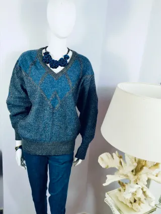 Jersey fino de primavera de manga larga con un diseño vibrante y llamativo. - Estampado geométrico de estilo étnico. - Combinación de colores vivos sobre fondo azul. - Tejido ligero, ideal para entretiempo. Talla XL, como talla 42. Medidas de hombro a hombro 43, de sisa a sisa 50, largo 63. Muy buen estado.
