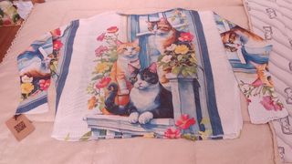Jersey nuevo con etiqueta, con un bonito estampado de gatos y flores. - Talla única, equivalente a XXL. - Diseño multicolor sobre fondo blanco.