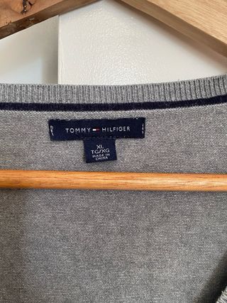 Jersey Tommy Hilfiger original en color azul jaspeado con cuello en pico (V-neck). 🔷 Talla XL 🔷 Cuello en pico 🔷 Logo bordado Tommy Hilfiger en el pecho 🔷 Corte clásico 🔷 Tejido cómodo y suave Estado: Muy buen estado, sin manchas ni descosidos. Ideal para entretiempo o invierno. Perfecto para combinar con camisa debajo o llevarlo solo con vaqueros.