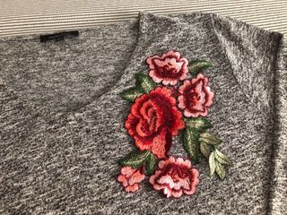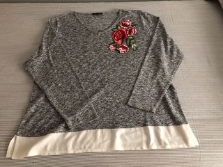 Jersey de manga larga con un diseño de flores bordadas en el pecho. La parte inferior tiene un detalle de tela blanca. - Diseño de flores rojas y rosas. - Manga larga. - Detalle de tela blanca en el bajo. Talla XL+