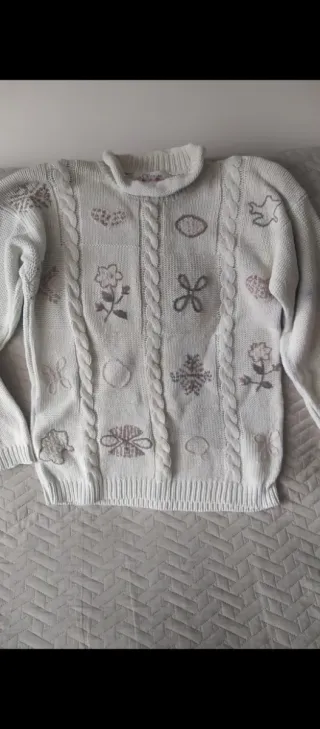 Jersey de mujer tejido en hilo grueso con un diseño encantador. Jersey de hilo gordo, cuello redondo para doblar, tiene en el delantero dibujos bordados de hilo en colores, pesa bastante Marca Clarine Talla XL Las medidas están en las fotos - Preciosos bordados de flores, mariposas y corazones. - Cuello alto - Puños y bajo elásticos.
