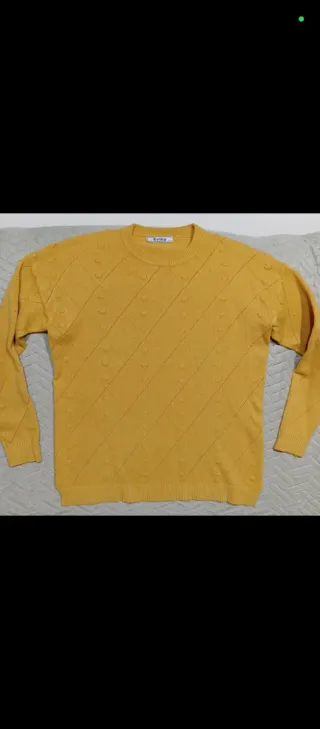 Jersey de lana para mujer, ideal para el frío. Jersey de mujer de punto, con dibujos en relieve , tiene unas pequeñas aberturas laterales en la parte de abajo. Marca Evima y talla L/XL Las medidas están en las fotos - Color mostaza vibrante. - Manga larga. - Diseño con rombos y pequeños detalles. - Cuello redondo.