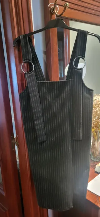 Pichi con un diseño de rayas verticales. Jersey manga corta gris claro - Diseño de rayas finas. - Tirantes con anillas metálicas.