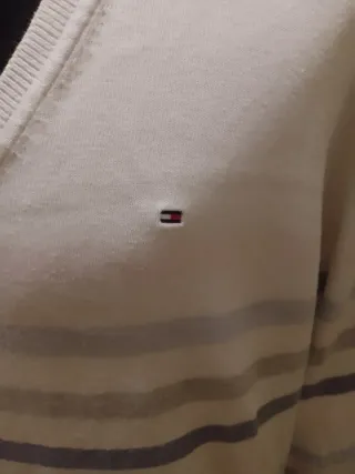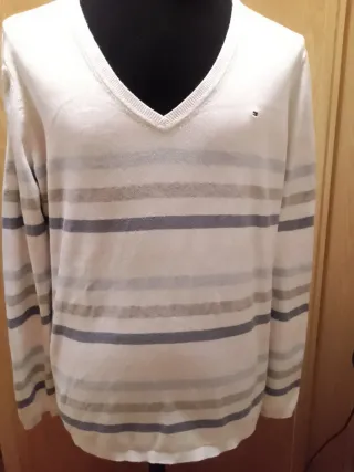 Jersey Tommy Hilfiger original de manga larga y cuello de pico, en color blanco con rayas horizontales en tonos grises y azulados. Tejido suave y agradable al tacto. Etiqueta interior de composición cortada, marca y talla visibles. Composición no especificada en etiqueta. Talla XL. Medidas en plano: Hombros 44 cm · Axila a axila 58 cm · Largo 65 cm · Manga 65 cm · Contorno manga superior 16 cm. Prenda en muy buen estado, clásica y atemporal.