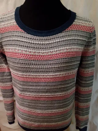 Jersey Tommy Hilfiger original de manga larga y cuello redondo, con diseño de rayas horizontales en tonos clásicos. Confeccionado principalmente en algodón, con un sutil hilo con brillo que aporta un toque especial sin ser excesivo. Talla M. Medidas en plano: Hombros 40 cm · Axila a axila 50 cm · Largo 60 cm · Manga 65 cm · Contorno manga 13 cm. Prenda cómoda, ligera y muy ponible. En muy buen estado.