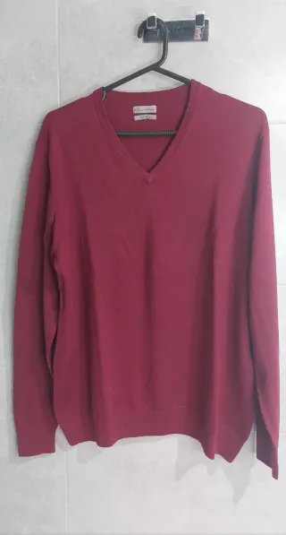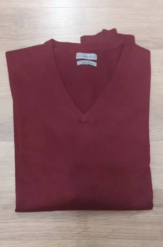 Jersey de cuello pico en lana merino 100%. - Tejido suave y transpirable. - Color Burdeos - Talla M (equivalente a 38-40 / 48-50).