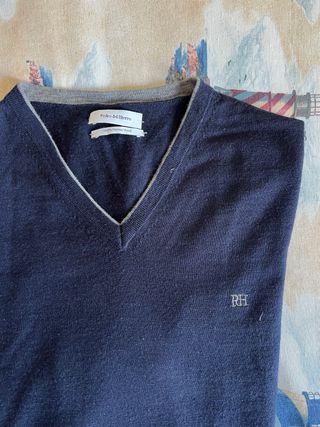 Jersey de punto fino con cuello en V de Pedro del Hierro como nuevo. - Logo bordado en la parte delantera. - Ribete gris en cuello y puños. - Composición: 100% lana merino.