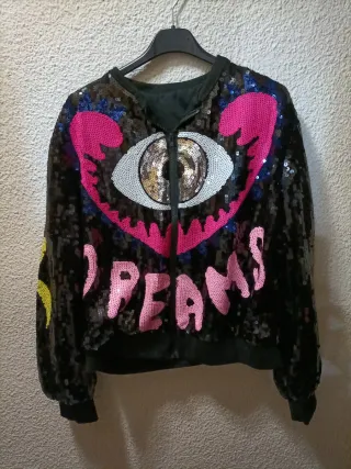 Jersey con lentejuelas negras y detalles en rosa, blanco y azul. Presenta un diseño de ojo en el centro y la palabra DREAMS en la parte inferior. - Lentejuelas brillantes. - Diseño llamativo. - Manga larga.