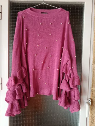 Jersey de punto en color buganvilla, adornado con perlas y mangas con volantes. - Diseño con perlas distribuidas por toda la prenda. - Mangas largas con múltiples volantes escalonados. - Tejido de punto suave. Paso medidas a continuación Pecho 170 cm Cadera 150 cm Largo 72 cm Largo manga 75 cm Bíceps manga 20 cm Perlas en delantero. Volantes en mangas