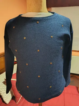 Jersey de punto azul marino con un diseño de estrellas doradas. - Diseño de estrellas. - Cuello redondo. - Manga larga.