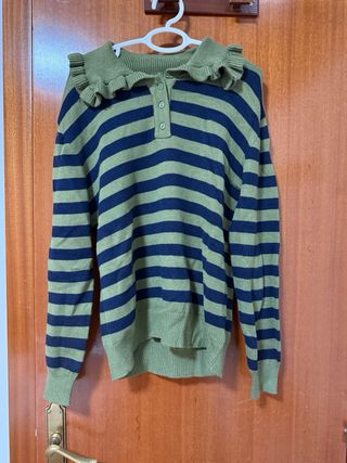 Jersey de rayas verdes y azul marino, con cuello de volantes. - Sin estrenar. - Cuello con botones. - Diseño de rayas horizontales.